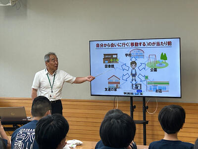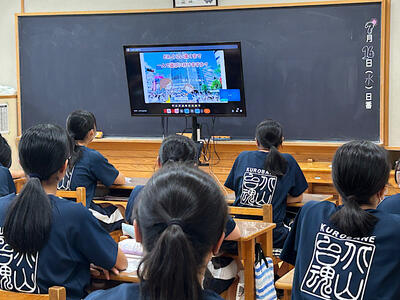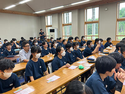 暑さ対策のため、1年生全員が会議室で対面で講話を聞きました。