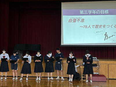 6月25日(水)、那須地区総合体育大会に向けて、決起集会を行いました。各部の部長が総体に向けた意気込みを発表した後、全校生徒で円陣を組み、大きな声で気合いを入れました。各部ともに、練習の成果を発揮して精一杯大会に臨んでほしいと思います。