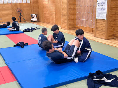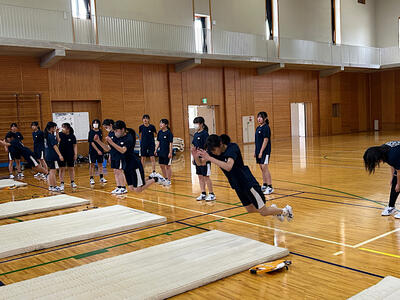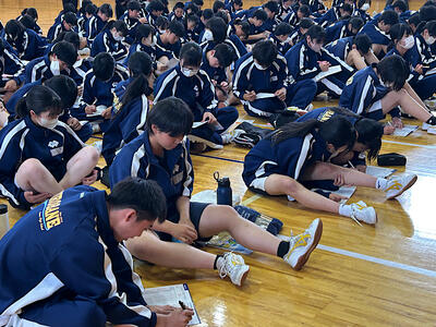 柔道場と剣道場では長座体前屈と上体起こしが行われました。