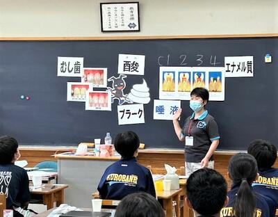 6月20日(金) 2名の歯科衛生士さんをお迎えして、歯科講話を実施しました。カラーテスターを使い、鏡で確認しながら、正しい歯磨きの仕方を学びました。また、歯と口の機能の大切さや、歯周病の予防についてお話をしていただきました。自分の歯を80歳で20本残すことができるように、食生活を見直したり、歯を丁寧に磨いたりしてほしいと思います。