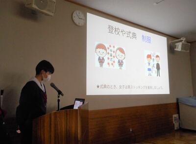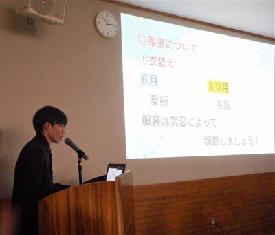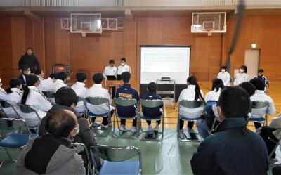 午後は、小学6年生とその保護者を対象に新入生説明会を実施しました。生徒会執行部や各部の部長が中学校の生活についてや各部活動についての説明を行いました。