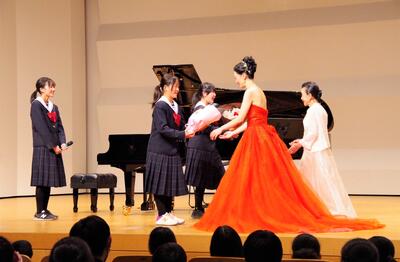 講話では、中学生までスイミングに力を入れ、当時のコーチから「限界を自分で決めない」と指導を受けたことや、音楽の道に進む中での恩師との出会い、学生時代の経験などを話してくださいました。その後、ショパンの名曲やパッフェルベルのカノン、伊福部昭先生作曲の「ゴジラ」のテーマ曲を演奏してくださり、音楽に乗せて大嶋さんが生徒に伝えたいことが心に響いてきたように感じました。