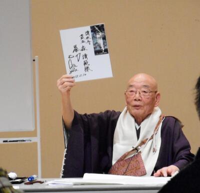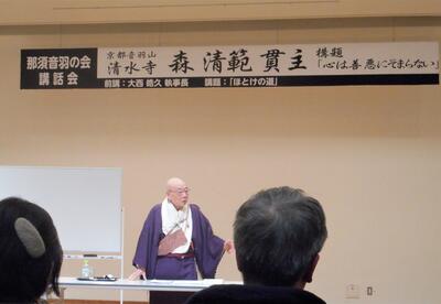 修学旅行で交流させていただいた、清水寺の森清範貫主が、11月23日(日)に与一伝承館にいらっしゃり、那須音羽の会主催の講話会で、「心は善悪にそまらない」という講題でお話しをしてくださいました。